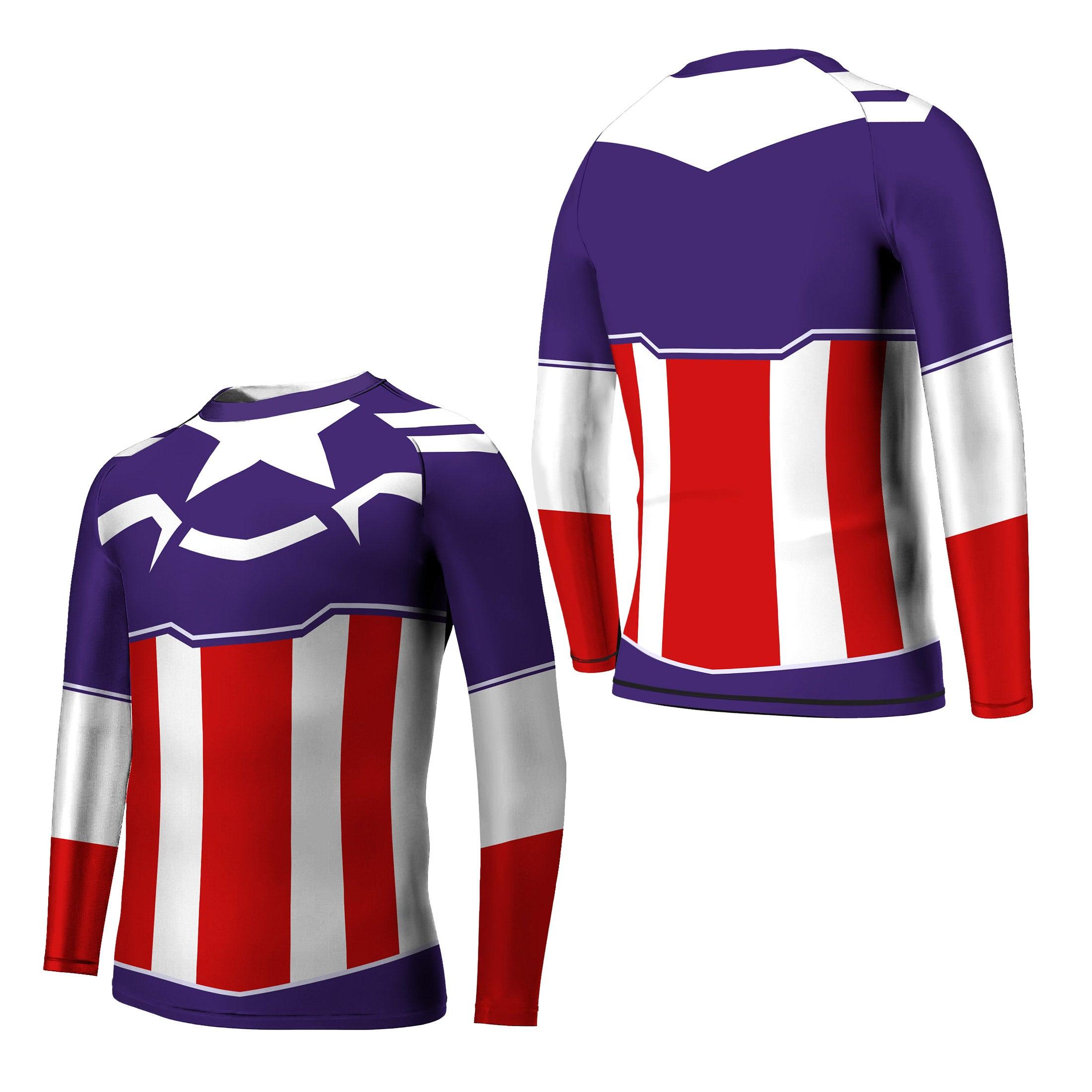 Drawing inspiration from the legendary realms of superheroes, Norse and Roman mythologies, and the vibrant tapestries of Asian cultures, this kids rash guard embodies the spirit of adventure and strength. The design captures the essence of Captain America Sam Wilson, merging the mystique of ancient myths with the dynamism of contemporary sports. This unique design language not only makes it visually appealing but also instills a sense of empowerment in young athletes.