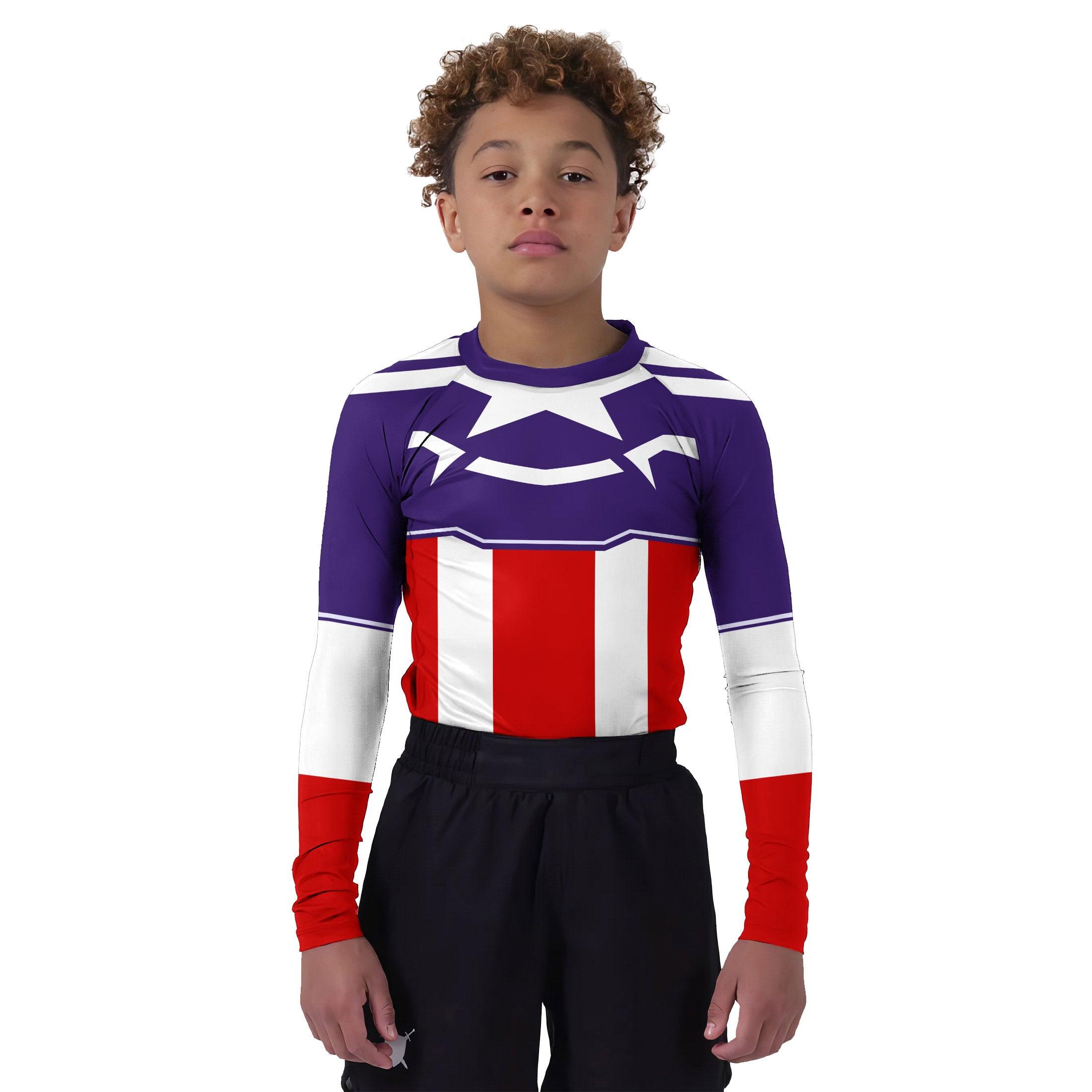Introducing the Captain America Sam Wilson Kids Rash Guard, a perfect blend of style, comfort, and functionality for young athletes. Designed for kids who are passionate about sports like MMA, Brazilian Jiu-Jitsu, Jiu-Jitsu, Muay Thai, No-Gi Jiu-Jitsu, Grappling, Wrestling, Kickboxing, and various fitness activities such as Gym Workouts and Crossfit, this rash guard is a must-have in their athletic wardrobe.