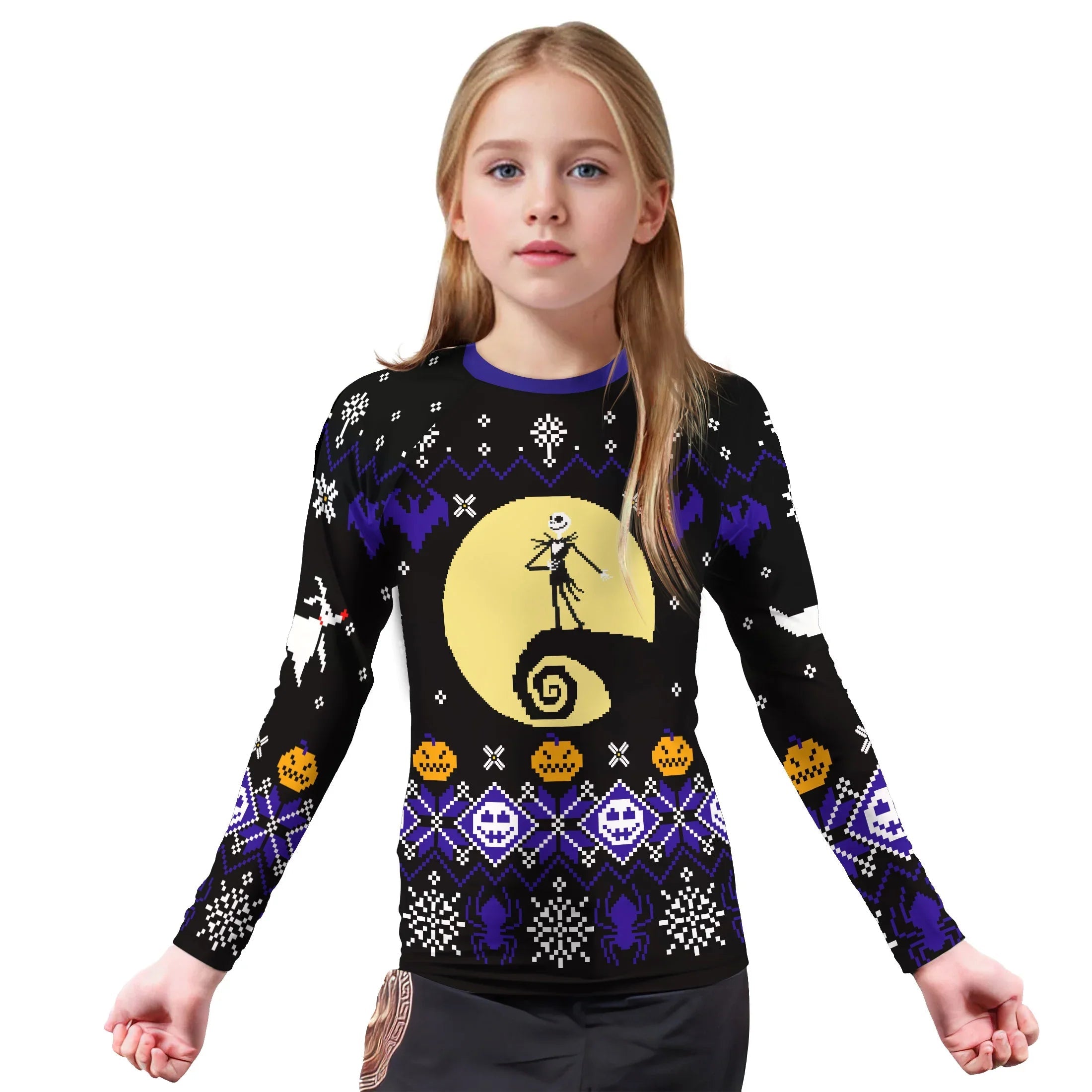 Let your young athlete embrace adventure and fitness in style with the Christmas Jack Skellington Blue Kids Rash Guard. Designed for enthusiastic kids who love sports, martial arts, and high-energy play, this rash guard brings together reliable protection, dynamic design, and all-day comfort. From Brazilian Jiu-Jitsu to wrestling, Crossfit, and general fitness, it’s the perfect layer for every activity, blending athletic performance with a playful holiday twist.