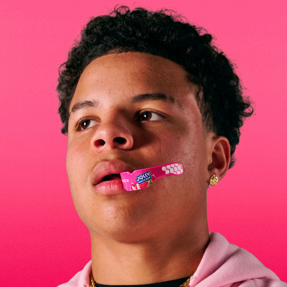 Youth Athlete Wearing Jolly Rancher Gel Max Power Flavor Fusion Mouthguard (Watermelon Flavor)