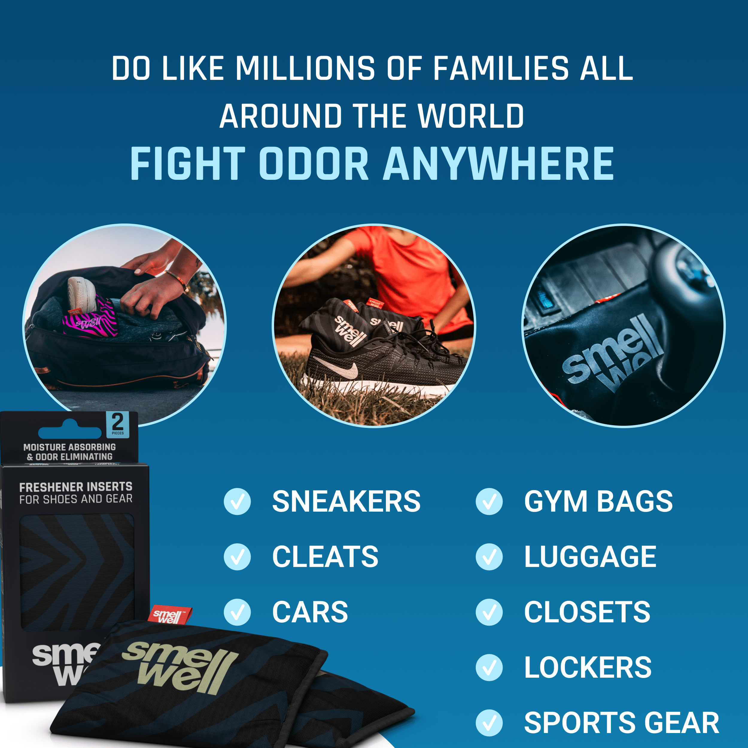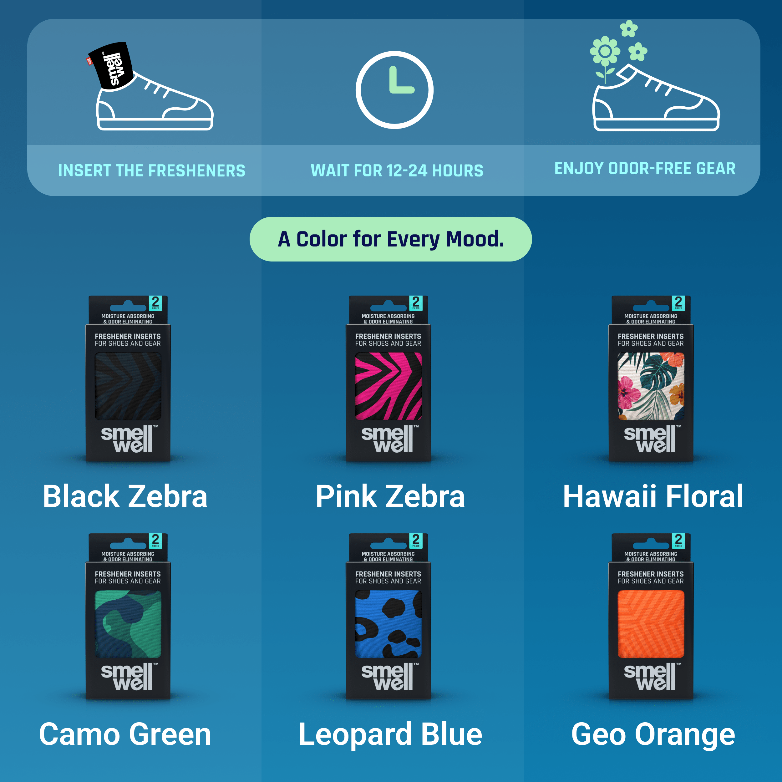 SmellWell Freshener Inserts is a natural 3-in-1 solution that effectively absorbs moisture, removes odors, and leaves a long-lasting fresh scent. Just throw them in your shoes, gear or bag and experience a real difference!